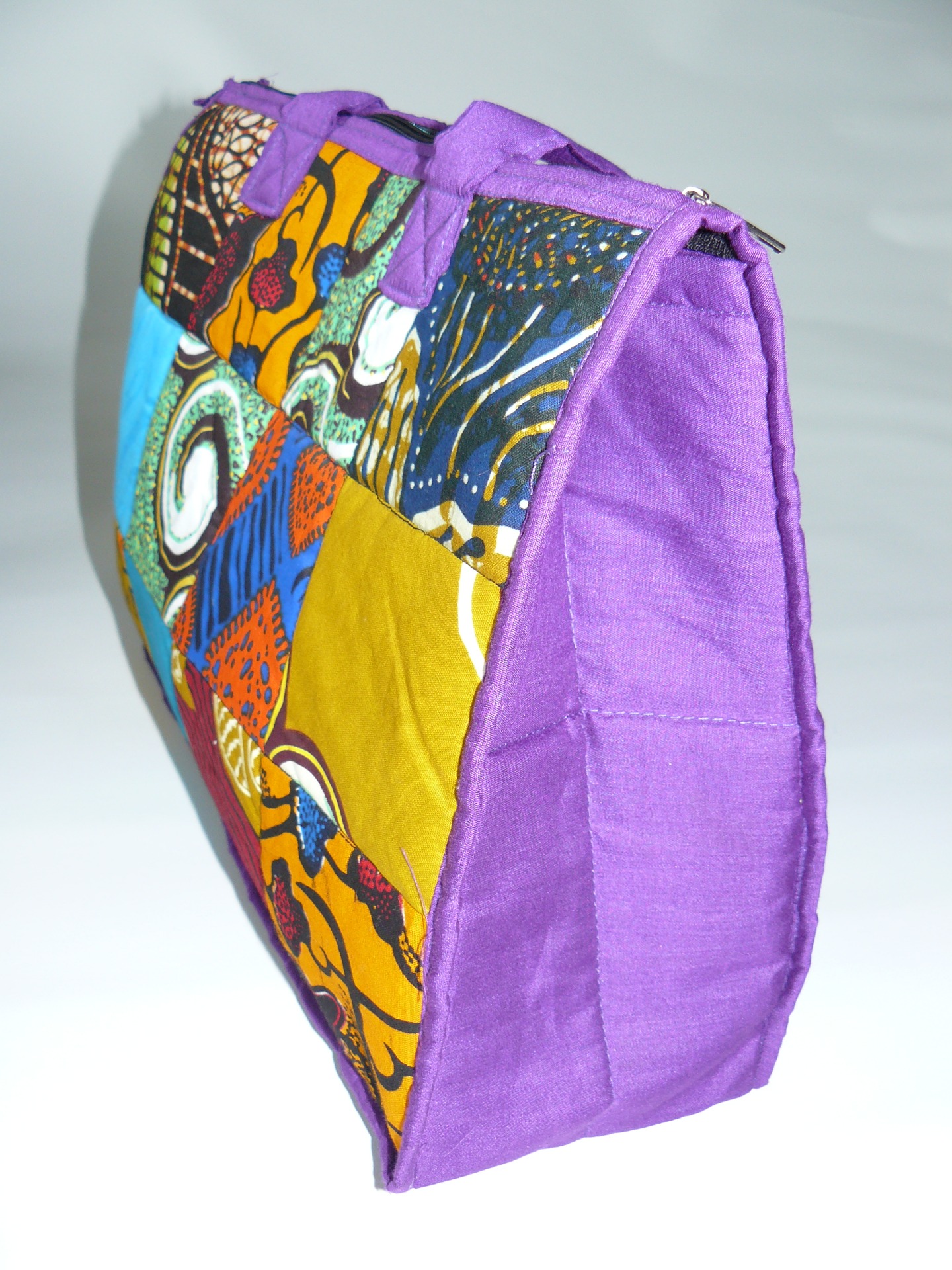 Deze kleurrijke katoenen tas met paarse accenten voor dames kan alles wat je dichtbij je wilt houden voor je dragen. De Afrikaans geprinte tas is een echte blikvanger, gemaakt van verschillende geprinte katoenen blokken, gecombineerd tot een perfecte compositie. Ze kan buitenshuis gebruikt worden en als je op reis bent, maar de tas is ook perfect voor gebruik op kantoor. Met deze handtas om je schouder zie je er uniek en prachtig uit. Ze combineert gemakkelijk met verschillende typen kleding door de diverse gekleurde prints.