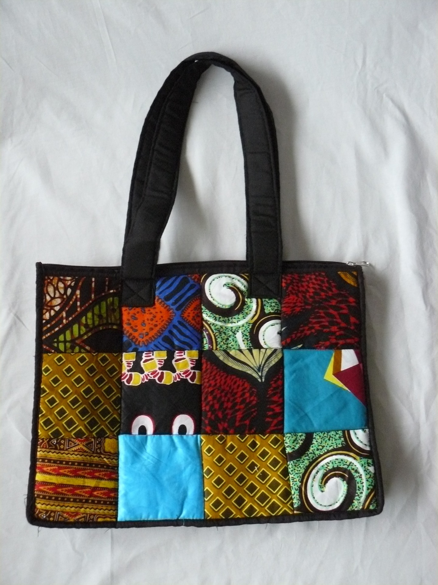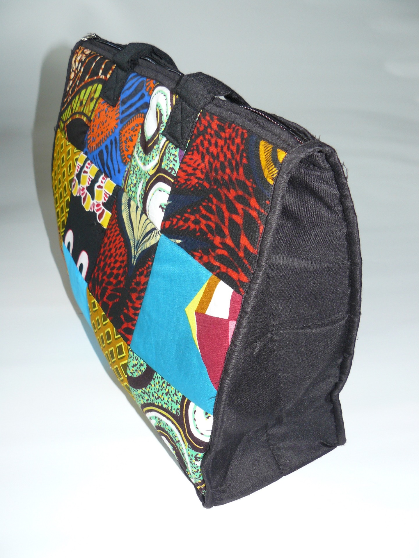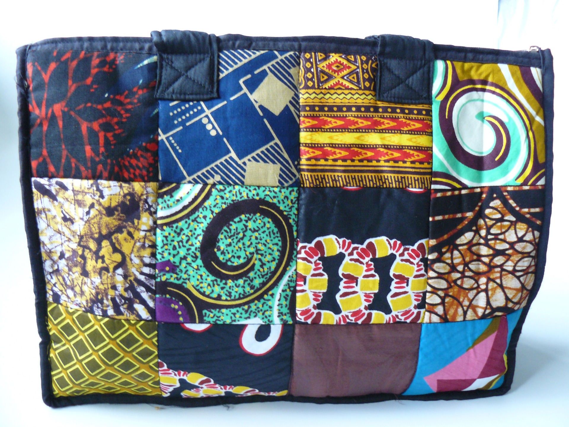 Deze kleurrijke katoenen tas met zwarte accenten voor dames kan alles wat je dichtbij je wilt houden voor je dragen. De Afrikaans geprinte tas is een echte blikvanger, gemaakt van verschillende geprinte katoenen blokken, gecombineerd tot een perfecte compositie. Ze kan buitenshuis gebruikt worden en als je op reis bent, maar de tas is ook perfect voor gebruik op kantoor. Met deze handtas om je schouder zie je er uniek en prachtig uit. Ze combineert gemakkelijk met verschillende typen kleding door de diverse gekleurde prints.